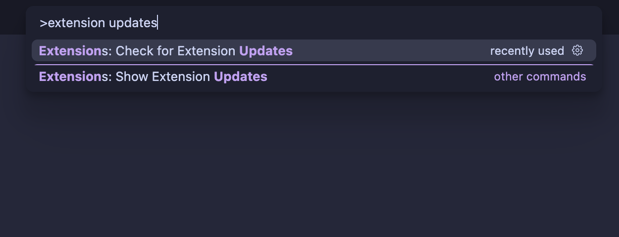 - Press Cmd/Ctrl + Shift + P, type "Extensions" and select "Check for Extension Updates".